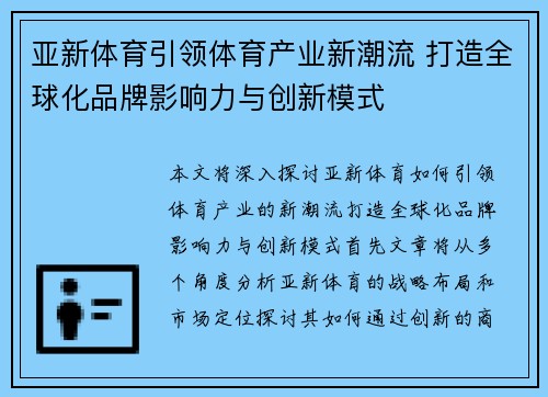 本文将深入探讨亚新体育如何引领体育产业的新潮流,打造全球化品牌影响力与创新模式。首先,文章将从多个角度分析亚新体育的战略布局和市场定位,探讨其如何通过创新的商业模式和全球化的战略,成为体育产业的重要推动者。接着,文章将分析亚新体育在全球市场的成功案例,并详细阐述其如何通过整合资源、利用先进的科技手段、构建强大的品牌效应,推动全球体育产业的转型与升级。此外,文章还将关注亚新体育在生态建设和合作伙伴关系上的独特优势,并讨论其如何通过多元化的合作与互利共赢的战略,进一步巩固其在国际体育产业中的领导地位。最后,文章将对亚新体育的未来发展做出前瞻性分析,并总结其对全球体育产业的深远影响。