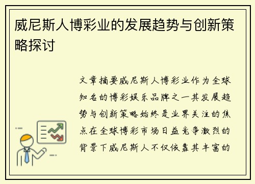 威尼斯人博彩业作为全球知名的博彩娱乐品牌之一,其发展趋势与创新策略始终是业界关注的焦点。在全球博彩市场日益竞争激烈的背景下,威尼斯人不仅依靠其丰富的博彩资源和优质的客户服务,在不断变化的市场需求中求得发展,还通过多种创新手段增强其竞争力。本文从四个方面对威尼斯人博彩业的发展趋势与创新策略进行了深入探讨:一是数字化转型的推动;二是市场多元化的拓展;三是技术创新与智能化应用的加强;四是可持续发展策略的实施。每个方面将从其当前的发展状况、面临的挑战以及未来的创新举措进行详细分析。通过对这些策略的分析,我们可以更好地理解威尼斯人在未来博彩行业中的发展方向与潜力。